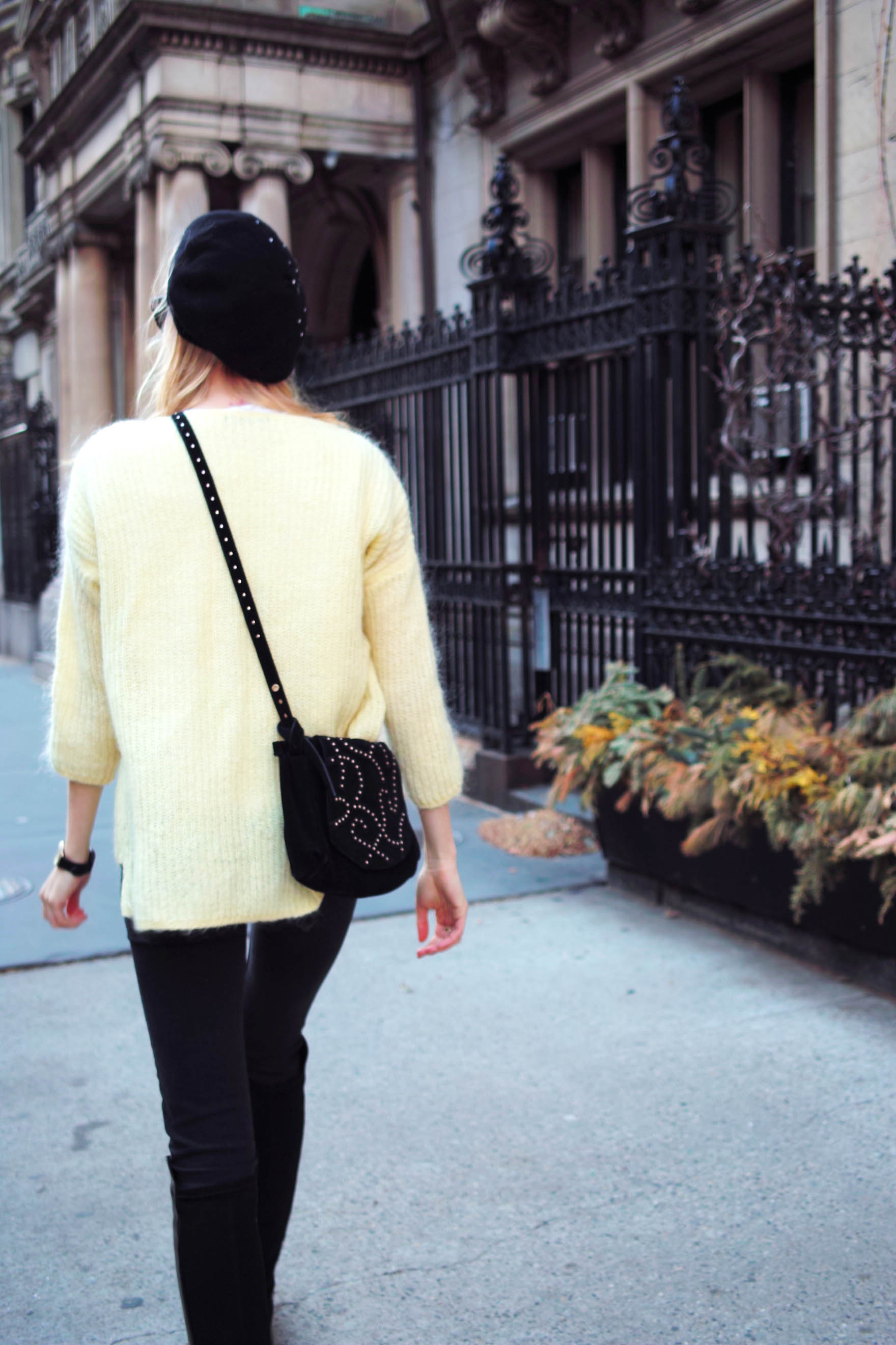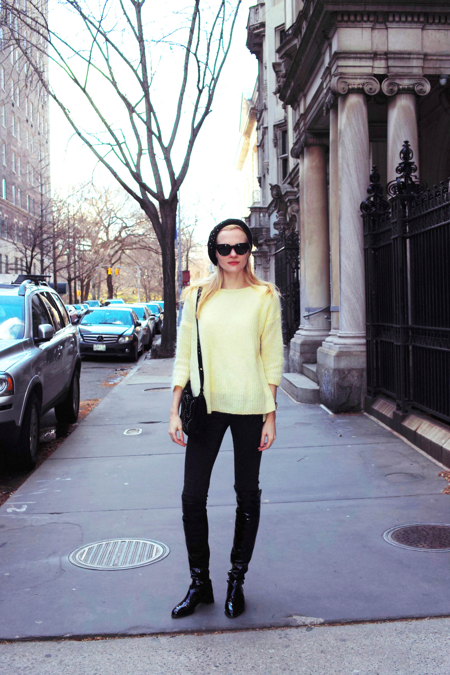 Love my Stuart Weitzman high boots! It is easy to style them with a heavy-knit cardigan or a light mohair sweater and a beret.